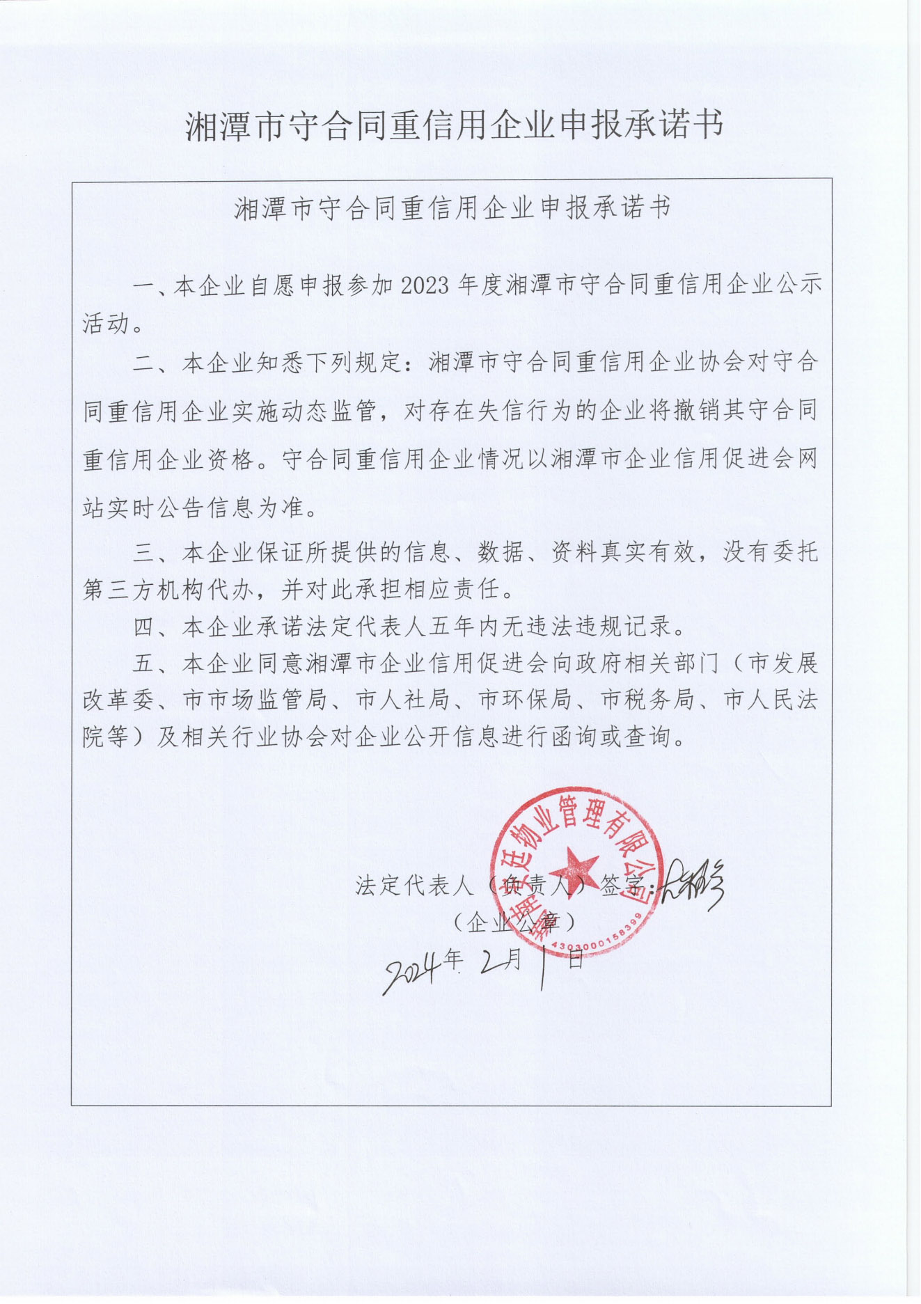 本企業(yè)根據(jù)《湘潭市守合同重信用企業(yè)申報規(guī)定》等編制 2023 年度企業(yè)信用報告書,并保證本報告書內(nèi)容真實、準確、完整。