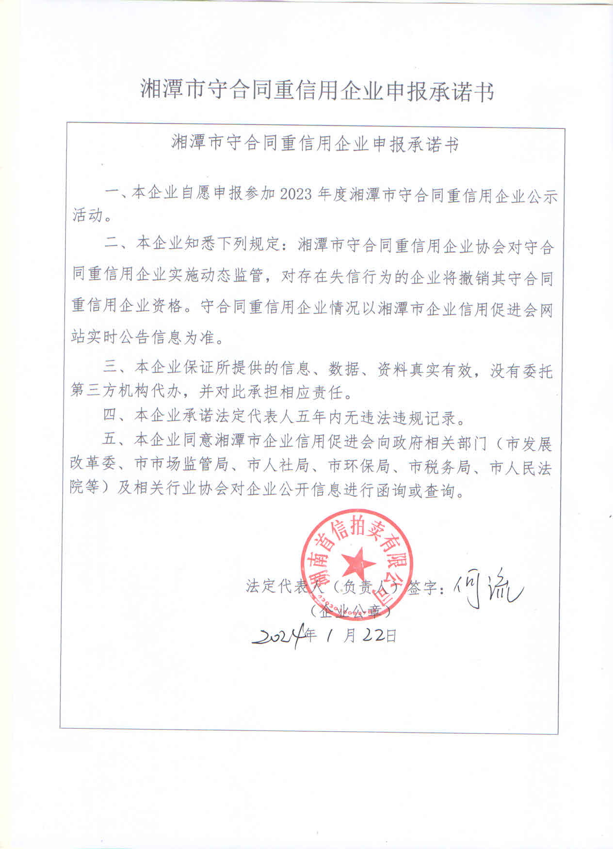 本企業(yè)根據(jù)《湘潭市守合同重信用企業(yè)申報規(guī)定》等編制 2023 年度企業(yè)信用報告書,并保證本報告書內(nèi)容真實、準(zhǔn)確、完整。