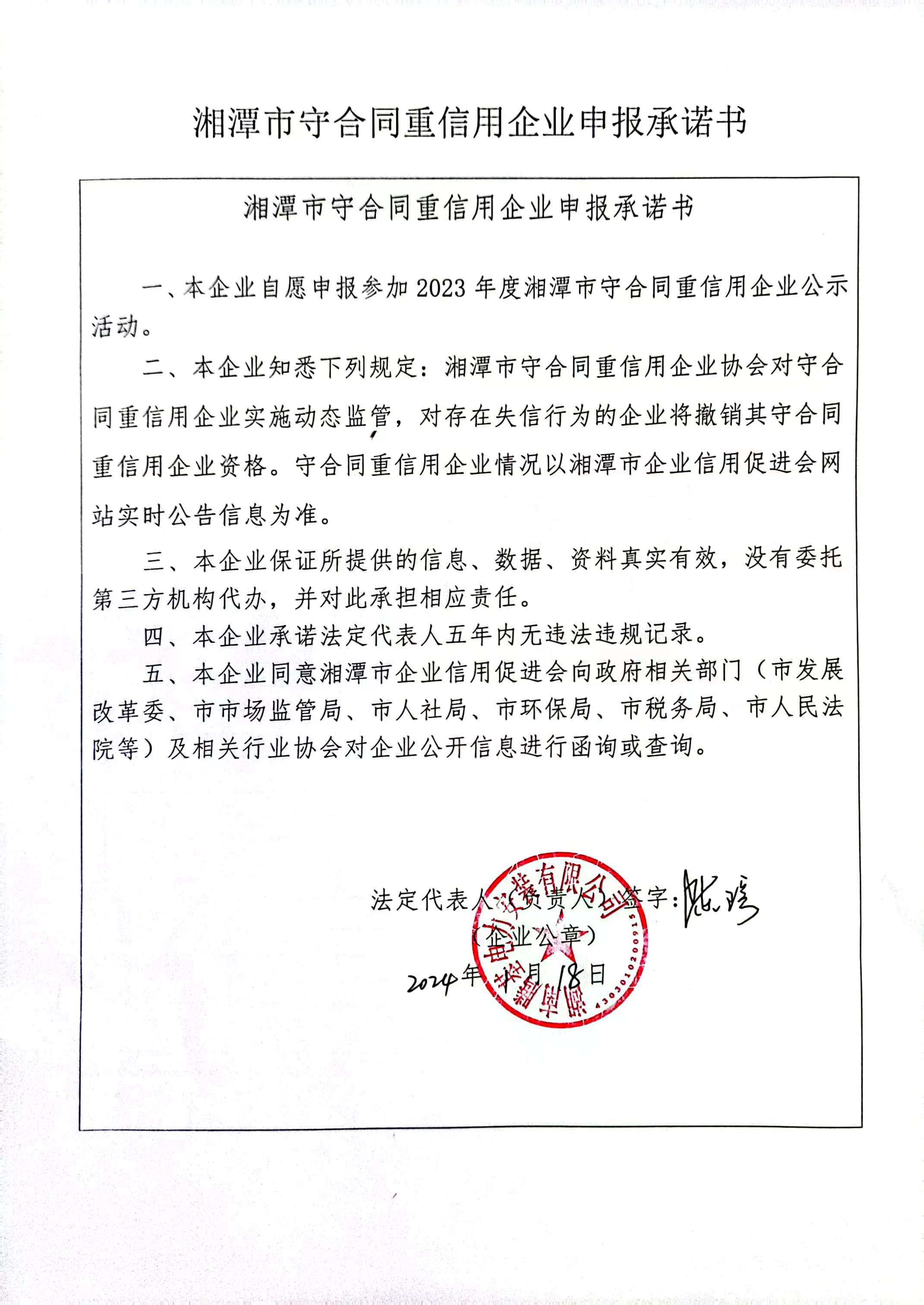 本企業(yè)根據(jù)《湘潭市守合同重信用企業(yè)申報規(guī)定》等編制 2023 年度企業(yè)信用報告書,并保證本報告書內(nèi)容真實、準(zhǔn)確、完整。