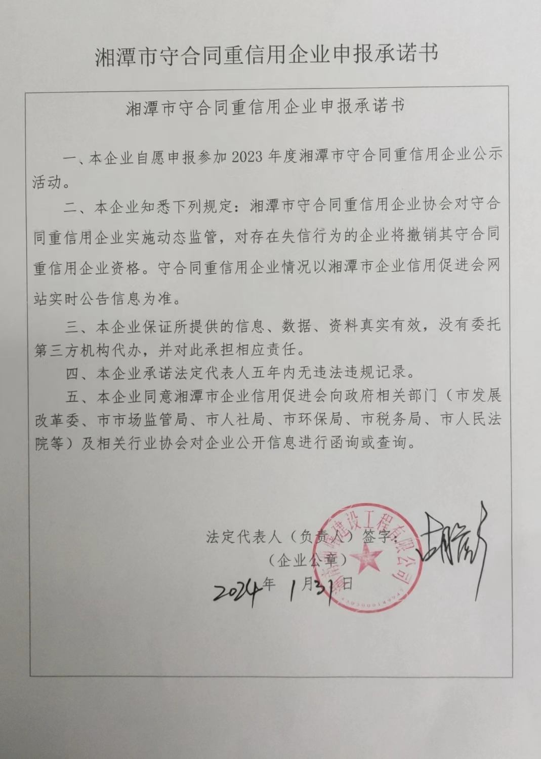 本企業(yè)根據(jù)《湘潭市守合同重信用企業(yè)申報規(guī)定》等編制 2023 年度企業(yè)信用報告書,并保證本報告書內(nèi)容真實、準確、完整。