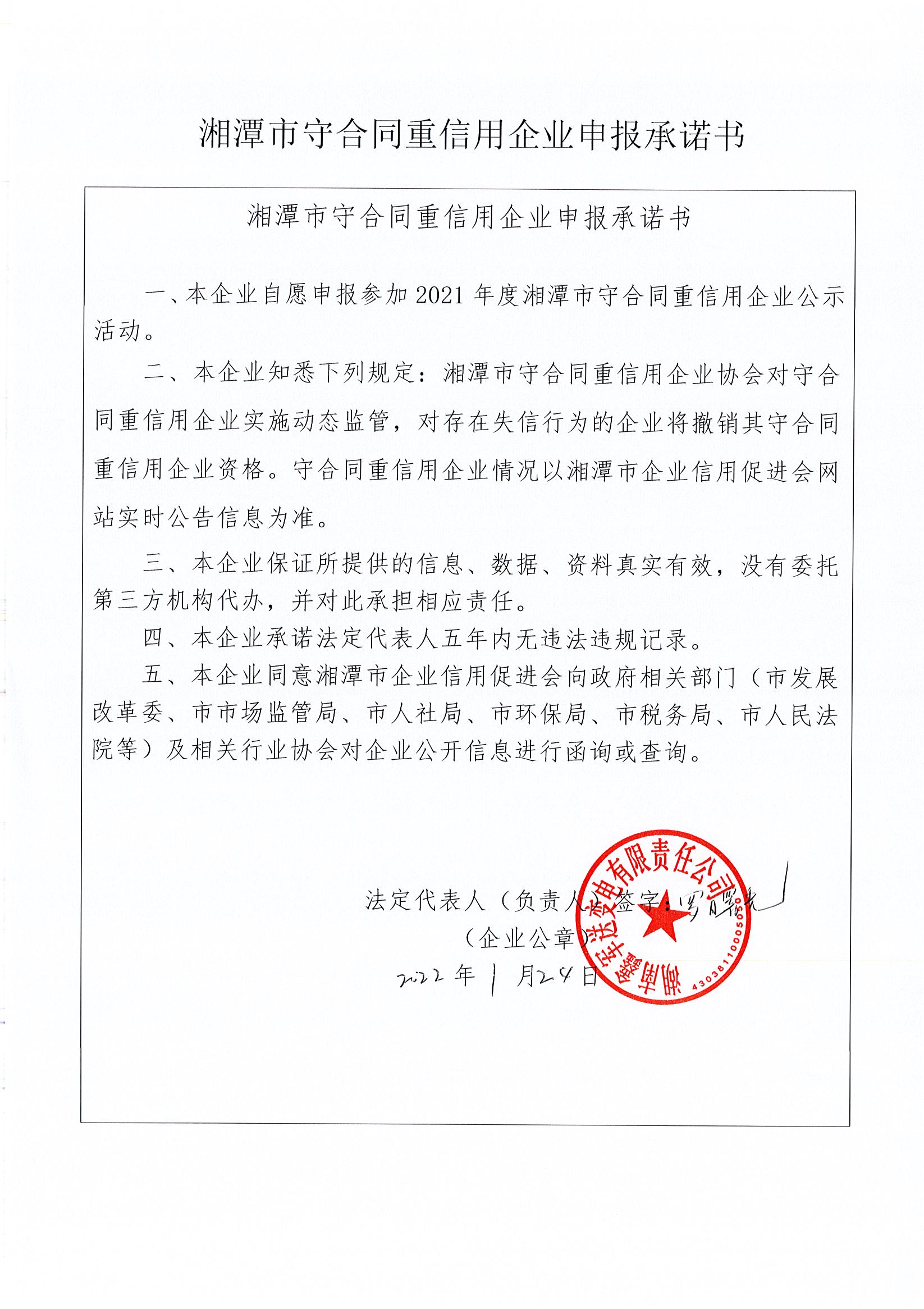 本企業(yè)根據(jù)《湘潭市守合同重信用企業(yè)申報(bào)規(guī)定》等編制 2021 年度企業(yè)信用報(bào)告書(shū),并保證本報(bào)告書(shū)內(nèi)容真實(shí)、準(zhǔn)確、完整。