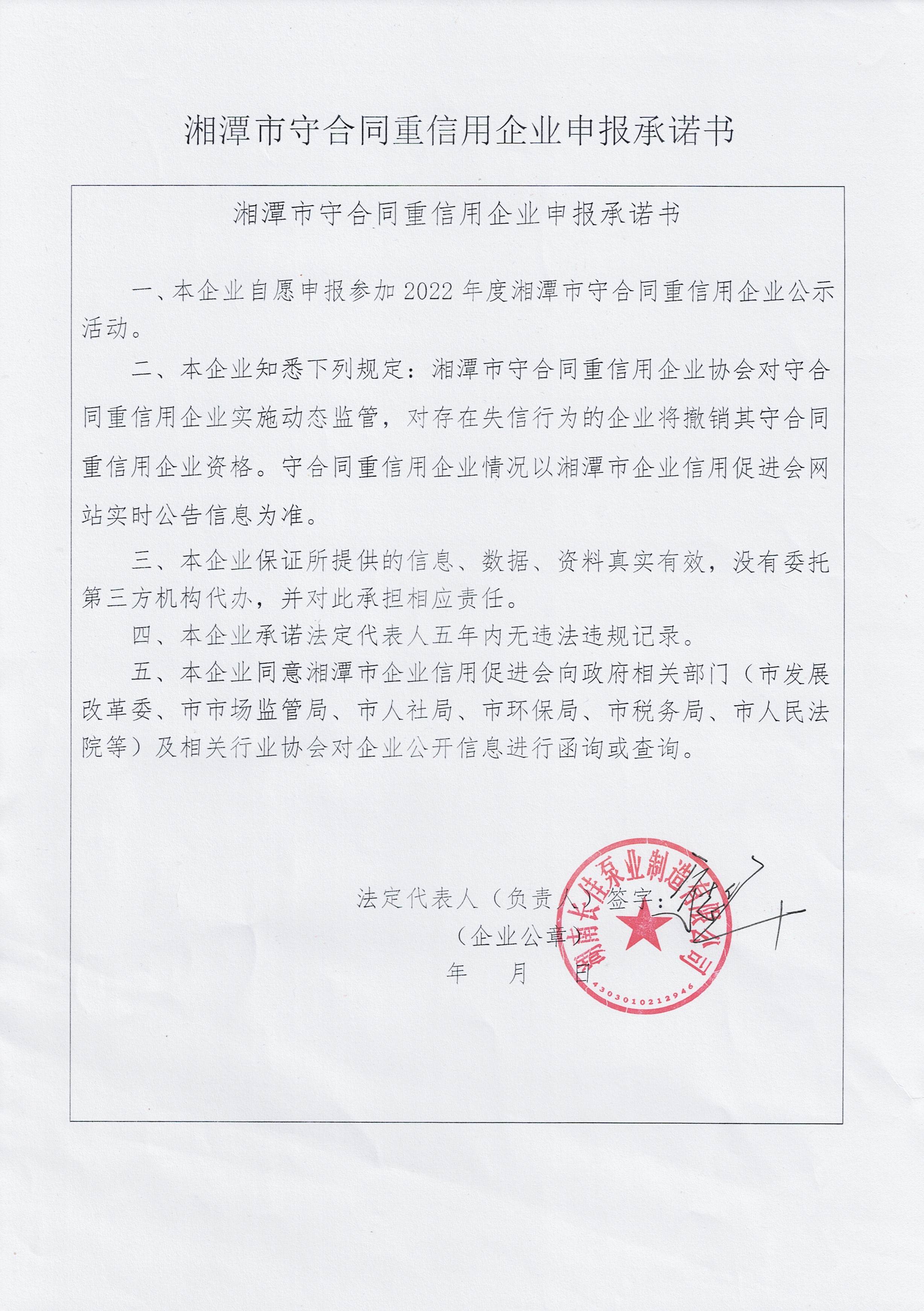 本企業(yè)根據(jù)《湘潭市守合同重信用企業(yè)申報規(guī)定》等編制 2022 年度企業(yè)信用報告書,并保證本報告書內(nèi)容真實、準(zhǔn)確、完整。
