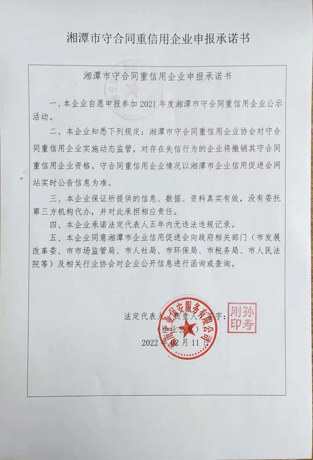 本企業(yè)根據(jù)《湘潭市守合同重信用企業(yè)申報規(guī)定》等編制 2021年度 年度企業(yè)信用報告書,并保證本報告書內(nèi)容真實、準確、完整。