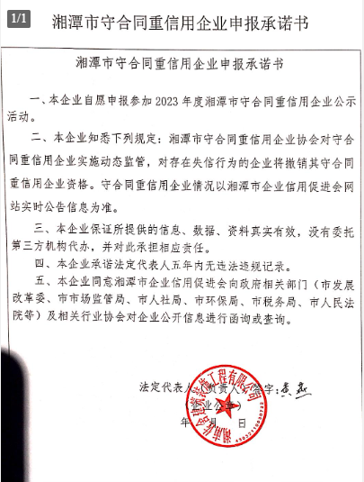 本企業(yè)根據(jù)《湘潭市守合同重信用企業(yè)申報規(guī)定》等編制 2023 年度企業(yè)信用報告書,并保證本報告書內容真實、準確、完整。