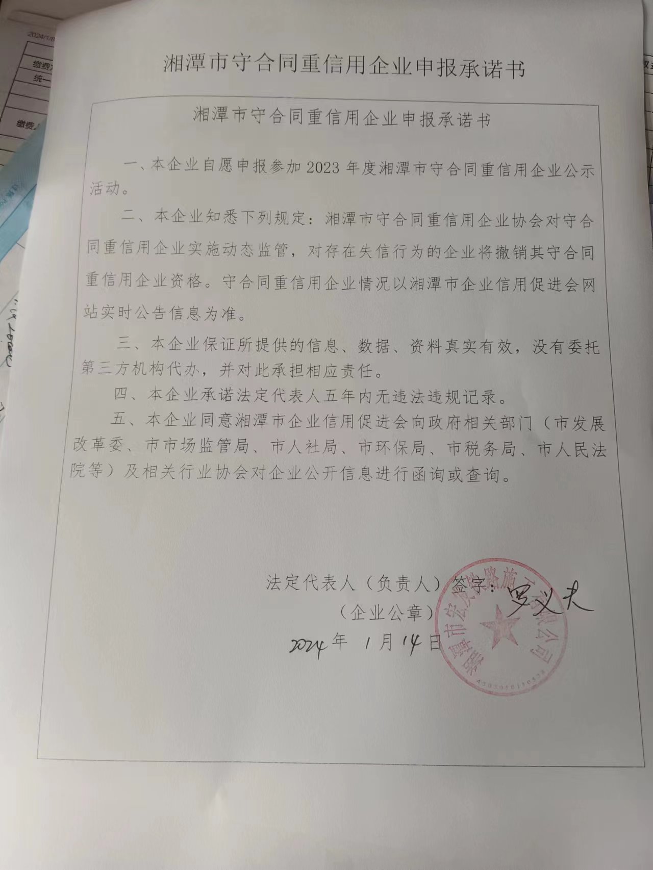 本企業(yè)根據(jù)《湘潭市守合同重信用企業(yè)申報(bào)規(guī)定》等編制 2023 年度企業(yè)信用報(bào)告書(shū),并保證本報(bào)告書(shū)內(nèi)容真實(shí)、準(zhǔn)確、完整。