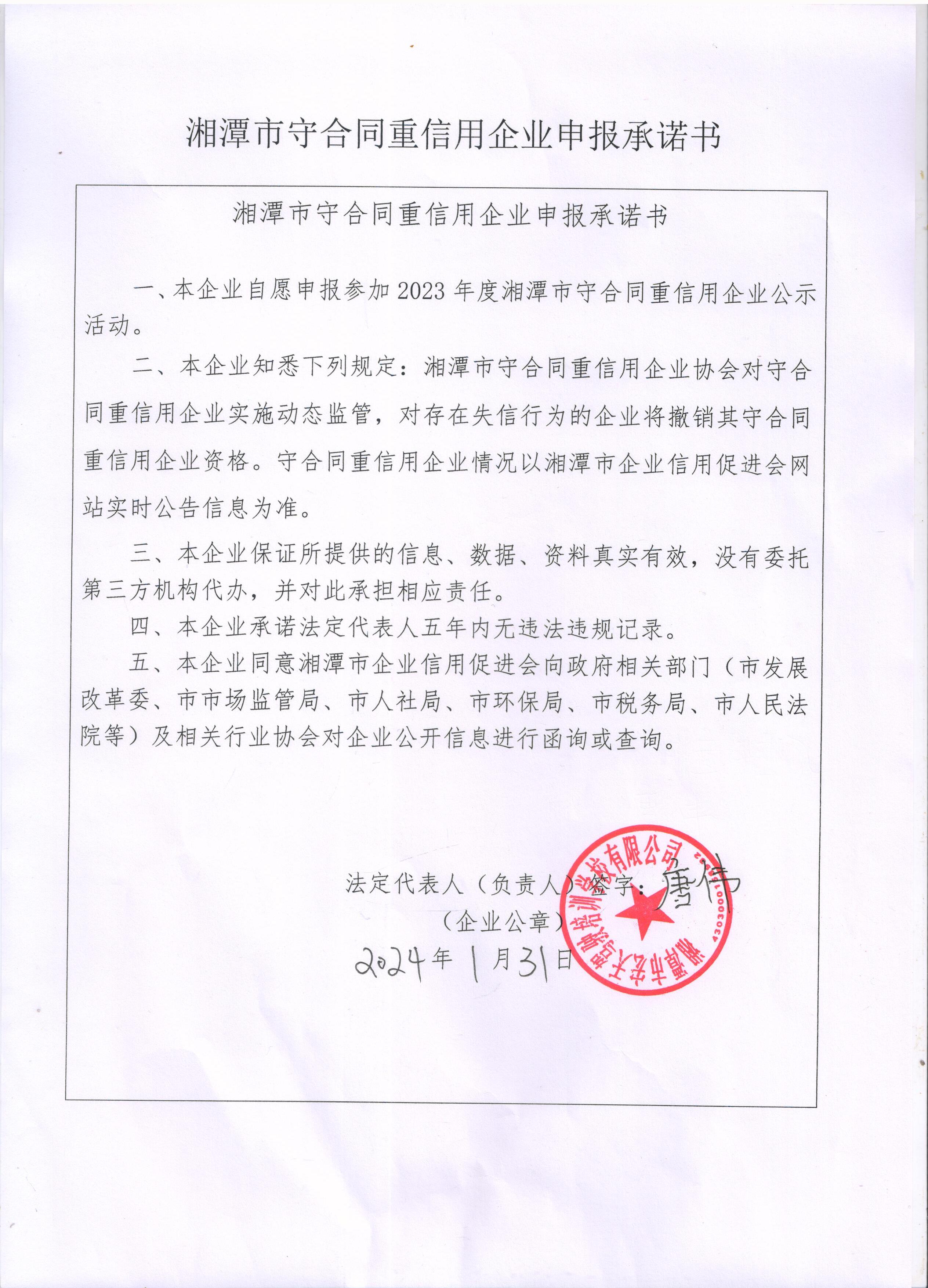 本企業(yè)根據(jù)《湘潭市守合同重信用企業(yè)申報(bào)規(guī)定》等編制 2023 年度企業(yè)信用報(bào)告書,并保證本報(bào)告書內(nèi)容真實(shí)、準(zhǔn)確、完整。
