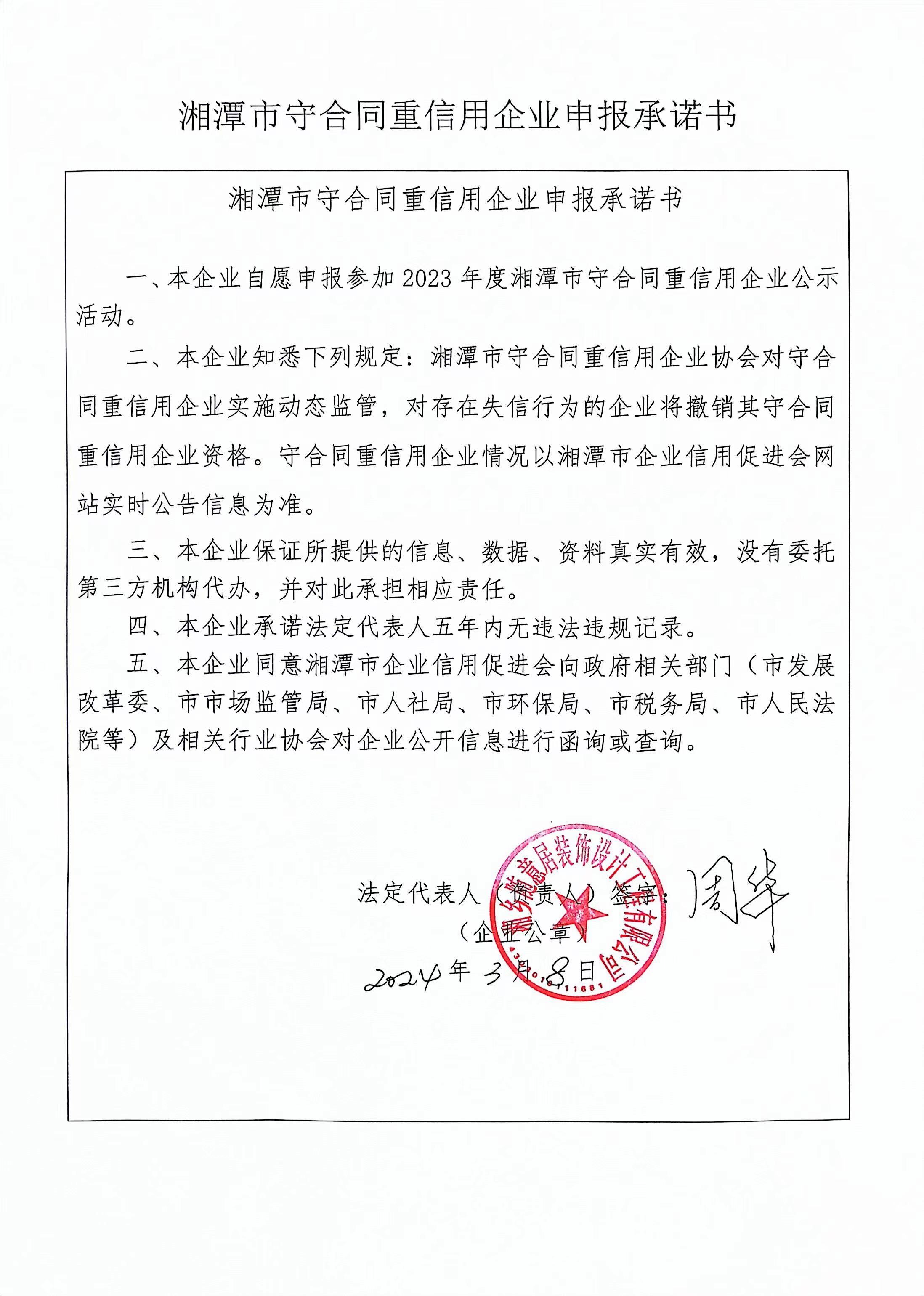 本企業(yè)根據(jù)《湘潭市守合同重信用企業(yè)申報規(guī)定》等編制 2023 年度企業(yè)信用報告書,并保證本報告書內(nèi)容真實、準(zhǔn)確、完整。