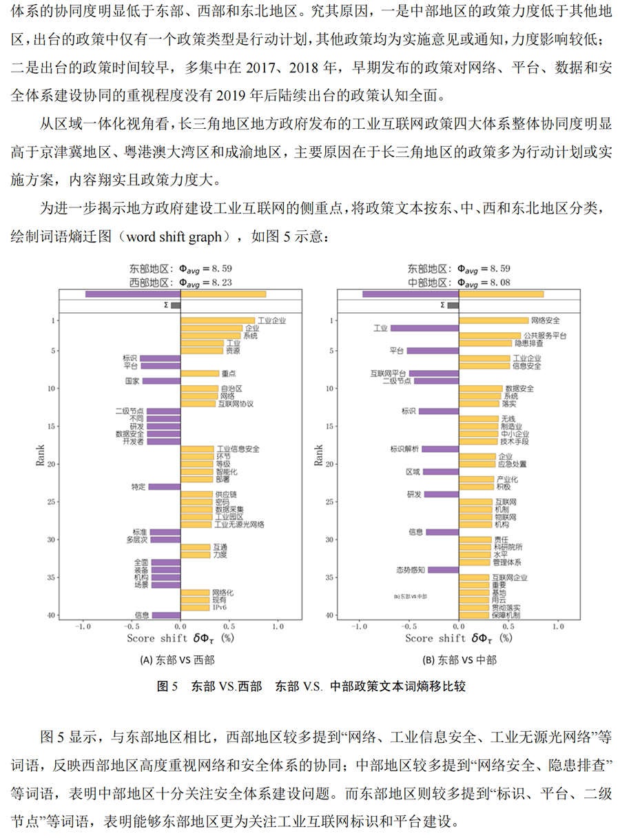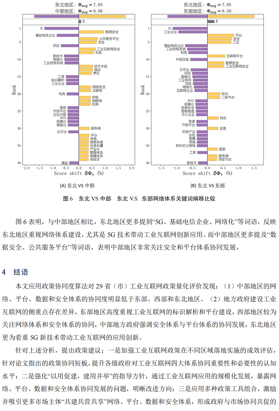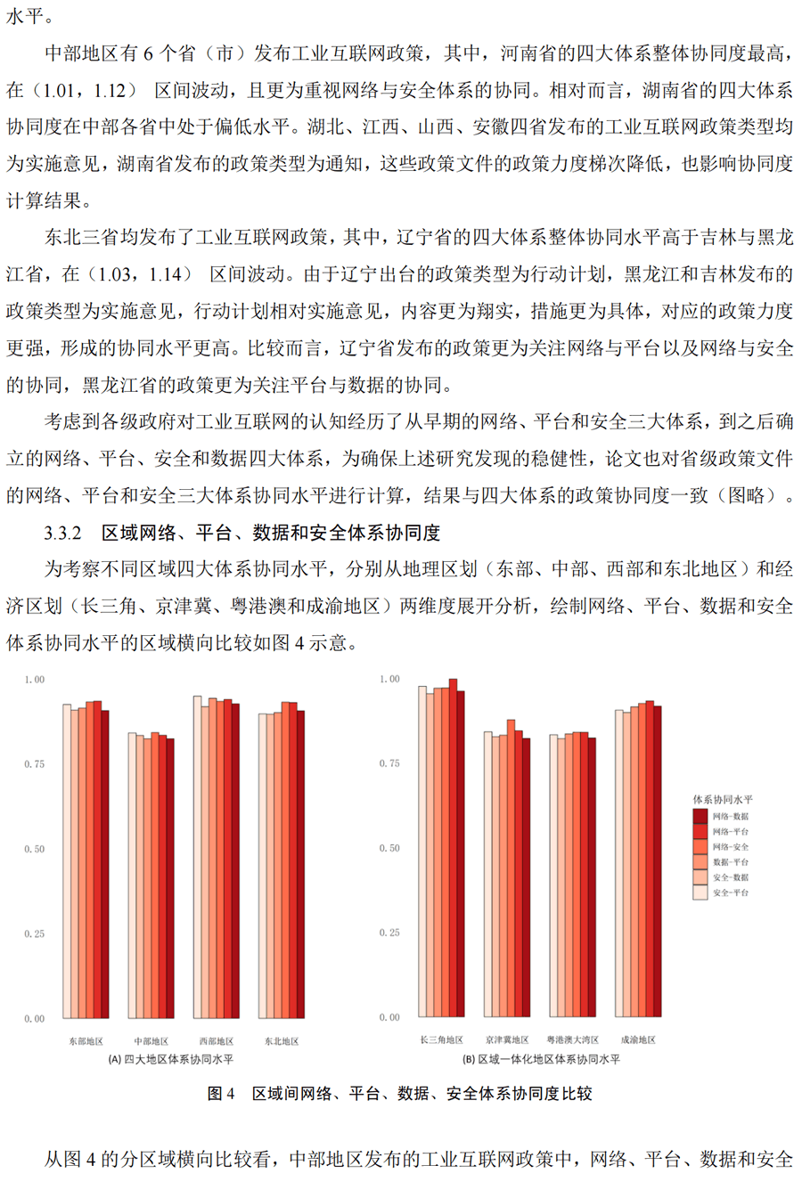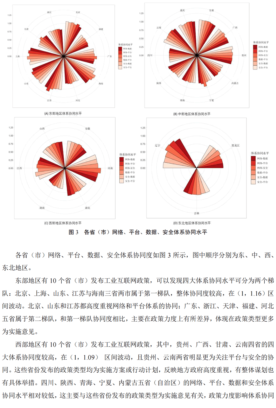 摘 要:我國工業(yè)互聯(lián)網(wǎng)發(fā)展具有典型的“政策指引,建用互促”特征。本文基于政策文本計算思路,構(gòu)建政 策協(xié)同度算法,定量評價 29 。ㄊ校┕I(yè)互聯(lián)網(wǎng)政策導向的網(wǎng)絡(luò)、平臺、數(shù)據(jù)、安全四大體系協(xié)同水平。研究 發(fā)現(xiàn)東部和西部地區(qū)的四大體系協(xié)同度G,中部地區(qū)相對偏低。各地推進四大體系協(xié)同建設(shè)的短板各異,反映 地方政府認知并發(fā)展工業(yè)互聯(lián)網(wǎng)的焦點存在差異。